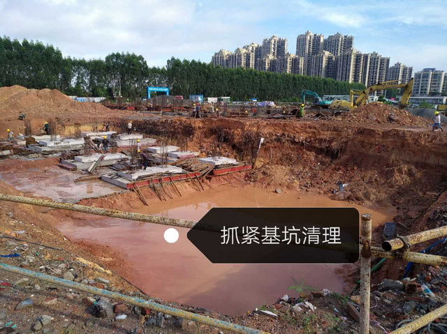 近期連續(xù)的大雨、暴雨,嚴(yán)重影響了施工。將挖好的基坑給泡了,項(xiàng)目部領(lǐng)導(dǎo)和工程師們檢查現(xiàn)場,并在雨停后指揮工人趕快抽水、排水,搶救被泡的基坑。