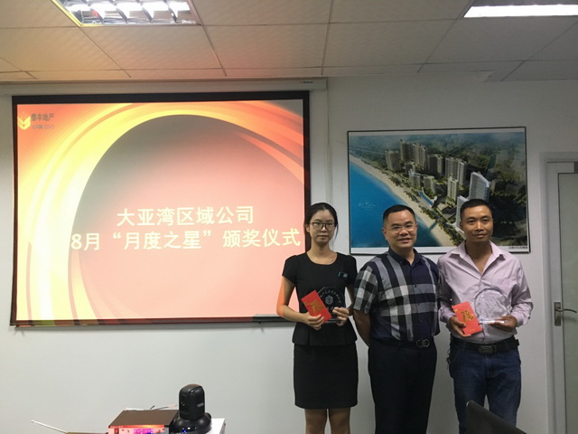 2017年9月11日,泰豐地產(chǎn)大亞灣區(qū)域公司舉辦了8月“月度之星”頒獎儀式, 區(qū)域總裁葉文治總宣讀獲獎名單及獲獎理由:李明兵對樁基礎(chǔ)的施工監(jiān)督、工程量現(xiàn)場收方工作認(rèn)真負(fù)責(zé),對項目的質(zhì)量、成本有突出貢獻(xiàn)。何歡歡在處理泡泡海業(yè)主投訴和維修工作積極及時,溝通能力強(qiáng),多次受到業(yè)主表揚。隨后為獲獎?wù)哳C發(fā)了現(xiàn)金獎1000元/人及紀(jì)念獎杯,以資鼓勵。