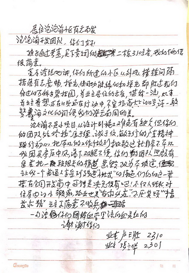2017年11月9日,泡泡海家園2棟2310業(yè)主專程為服務(wù)中心送來了表揚信,感謝物業(yè)工作人員細(xì)致入微、盡心盡責(zé)的服務(wù),表達(dá)自己對物業(yè)和開發(fā)商的感激之情。