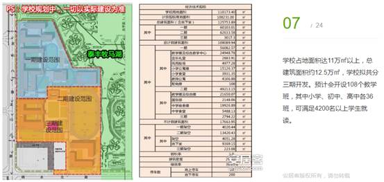 學(xué)校占地面積達(dá)11萬㎡以上,總建筑面積約12.5萬㎡,學(xué)校擬共分三期開發(fā)。預(yù)計(jì)會(huì)開設(shè)108個(gè)教學(xué)班,其中小學(xué)、初中、高中各36班,可滿足4200名以上學(xué)生就讀。