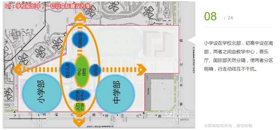 小學(xué)設(shè)在學(xué)校北部,初高中設(shè)在南部,兩者之間由教學(xué)中心,音樂廳、國(guó)際部天然分隔,使兩者分區(qū)明確,行走動(dòng)線互不干擾。