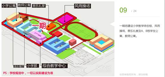 一期將建設(shè)小學(xué)教學(xué)綜合樓、風(fēng)雨操場(chǎng)、音樂禮堂及A、B棟學(xué)生公寓、教師公寓。