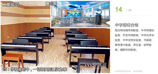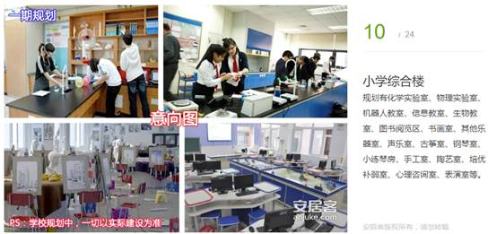 規(guī)劃有化學(xué)實(shí)驗(yàn)室、物理實(shí)驗(yàn)室、機(jī)器人教室、信息教室、生物教室、圖書閱覽區(qū)、書畫室、其他樂器室、聲樂室、古箏室、鋼琴室、小練琴房、手工室、陶藝室、培優(yōu)補(bǔ)弱室、心理咨詢室、表演室等。