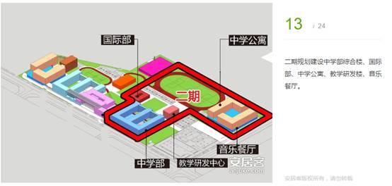 二期規(guī)劃建設(shè)中學(xué)部綜合樓、國(guó)際部、中學(xué)公寓、教學(xué)研發(fā)樓、音樂餐廳。