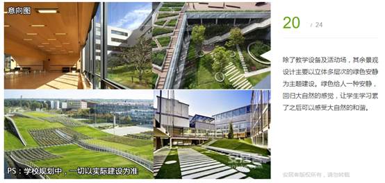 除了教學(xué)設(shè)備及活動(dòng)場(chǎng),其余景觀設(shè)計(jì)主要以立體多層次的綠色安靜為主題建設(shè)。綠色給人一種安靜,回歸大自然的感覺,讓學(xué)生學(xué)習(xí)累了之后可以感受大自然的和諧。