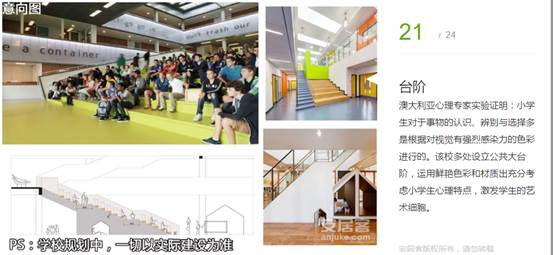 澳大利亞心理專家實(shí)驗(yàn)證明:小學(xué)生對(duì)于事物的認(rèn)識(shí)、辨別與選擇多是根據(jù)對(duì)視覺有強(qiáng)烈感染力的色彩進(jìn)行的。該校多處設(shè)立公共大臺(tái)階,運(yùn)用鮮艷色彩和材質(zhì)出充分考慮小學(xué)生心理特點(diǎn),激發(fā)學(xué)生的藝術(shù)細(xì)胞。