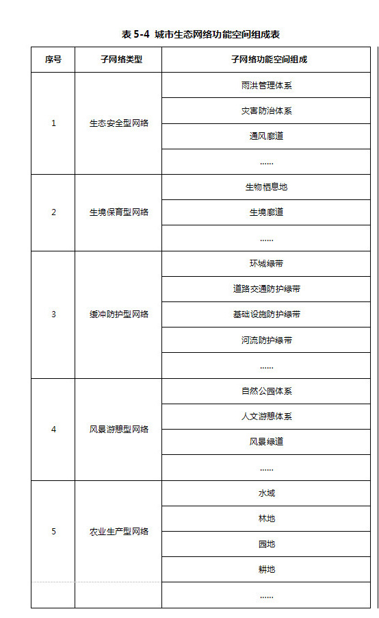 按照生態(tài)網(wǎng)絡(luò)功能用途,分別建構(gòu)生態(tài)安全型網(wǎng)絡(luò)、生境保育型網(wǎng)絡(luò)、緩沖防護(hù)型網(wǎng)絡(luò)、風(fēng)景游憩型網(wǎng)絡(luò)以及農(nóng)業(yè)生產(chǎn)型網(wǎng)絡(luò)五種類型的功能性子網(wǎng)絡(luò)。(詳見表5-4)